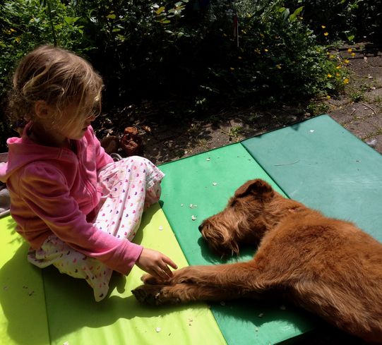Drei Irish Terrier - zwischen 14 und 1 Jahr alt - mit Besuchskind